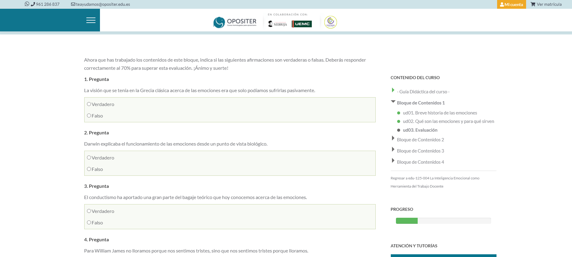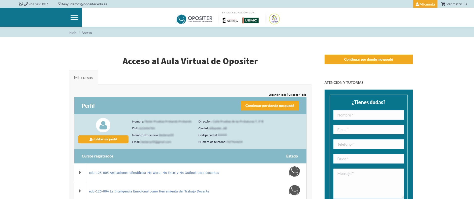 En Opositer una vez que te has matriculado en tu curso capacitación docente online, podrás acceder, de forma momentánea, a tu Aula Virtual o lo que es lo mismo, el área privada de Opositer. Aquí encontrarás las diferentes unidades didácticas que tendrás que ir superando. En función del curso online que elijas y de su número de horas, cada cierto número de unidades didácticas efectuadas deberás realizar una prueba tipo test que te planteará también la propia plataforma. No tienes por qué preocuparte, ya que la propia aplicación de Opositer te irá ayudando y guiando por el itinerario a seguir.