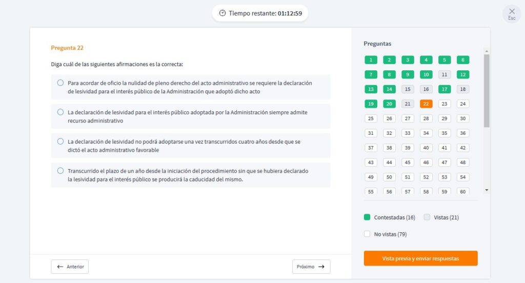 Muchos opositores no solo se enfrentan al reto de memorizar contenido, sino también de aprender a gestionar el tiempo y la presión en el examen real. Si ya has pasado por un proceso selectivo, sabrás que nunca es igual ir haciendo las cosas a tu marcha y en el confort de tu sitio de estudio, que estar frente a frente con el examen oficial y en un ambiente de nervios y prisas porque el tiempo corre. Con nuestra plataforma, podrás entrenarte en condiciones similares a las del examen oficial, luchando contra la cuenta atrás para ir cogiendo confianza y mejorar tu capacidad de respuesta.